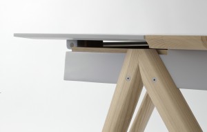 Der Schreibtisch strahlt – trotz des ungewöhnlichen Tragsystems, durch die Farbgebung und der ihm zugrunde liegenden, statischen Logik – Selbstverständlichkeit, Ruhe und Vertrautheit aus. Definierte Flächen, durchdachte Einsätze, eine Klappe – die gleichzeitig als Pinnwand dient – und ein monolithischer Schub mit verstecktem Magnetschloss erheben sich auf einer fast wie gewachsen wirkenden Gestellkonstruktion. Die Form zeigt die Gestaltung und Werte des traditionellen Schreinerhandwerks, verliert jedoch nicht den Bezug zum modernen Zeitgeist. Die Arbeitsfläche erinnert durch das Spiel aus Fugen, Flächen und Farbe an Kunstwerke des berühmten niederländischen Künstlers aus der Bauhauszeit.