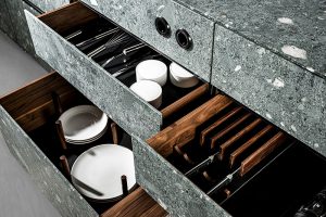 ST-ONE – Der Star unter den Natursteinküchen ist in acht besonderen Gesteinsarten, unterschiedlichsten Ausführungsvarianten, einer beliebigen Länge sowie einer Tiefe bis zu 145 cm verfügbar. Die Korpusbreite kann in jedem Zentimeter-Maß, somit absolut individuell, entworfen werden. Außerdem sind neben den Laden und Auszügen auch die Türen bis zu einer Breite von 50 cm möglich. Der Flexibilität und Planung Ihrer ST-ONE sind demnach kaum Grenzen gesetzt.